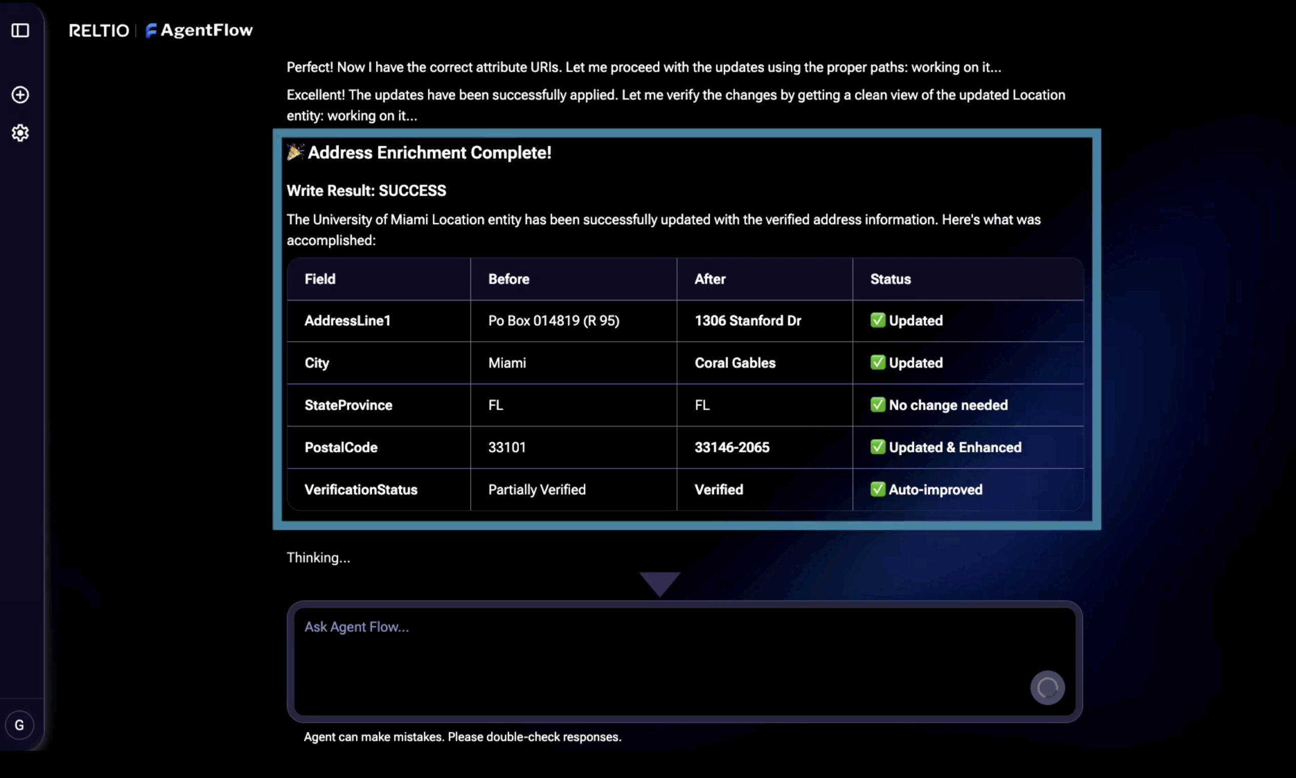 Our address enricher agent automates address verification using agentic web searches of public sources to enrich profiles, improving data accuracy and completeness.