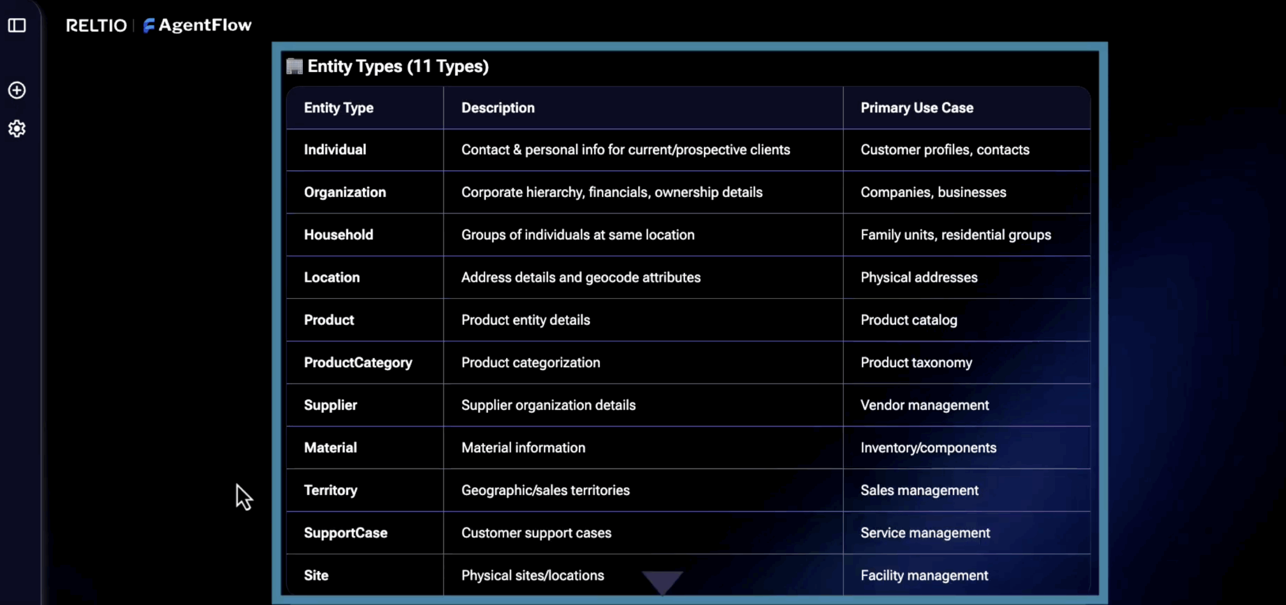 Built on Reltio Data Cloud, Reltio AgentFlow uses unified, secure data from Reltio Intelligent 360™ and Reltio Multidomain MDM™ to power AI agents that you can trust for accuracy and compliance.