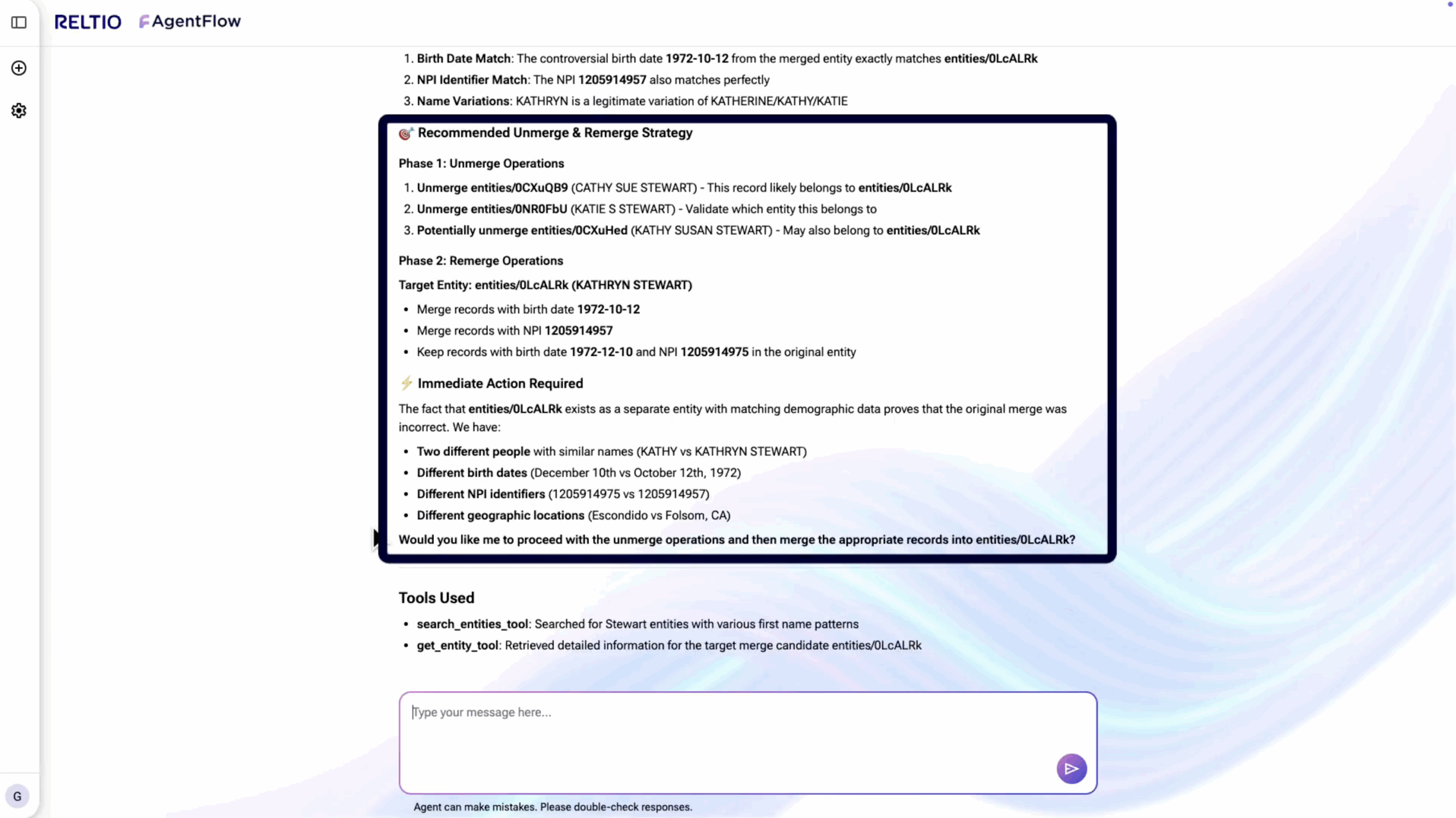 Our unmerger agent detects incorrect merges, recommends safe reversals, and restores records with full auditability—reducing errors and strengthening trust in golden data.