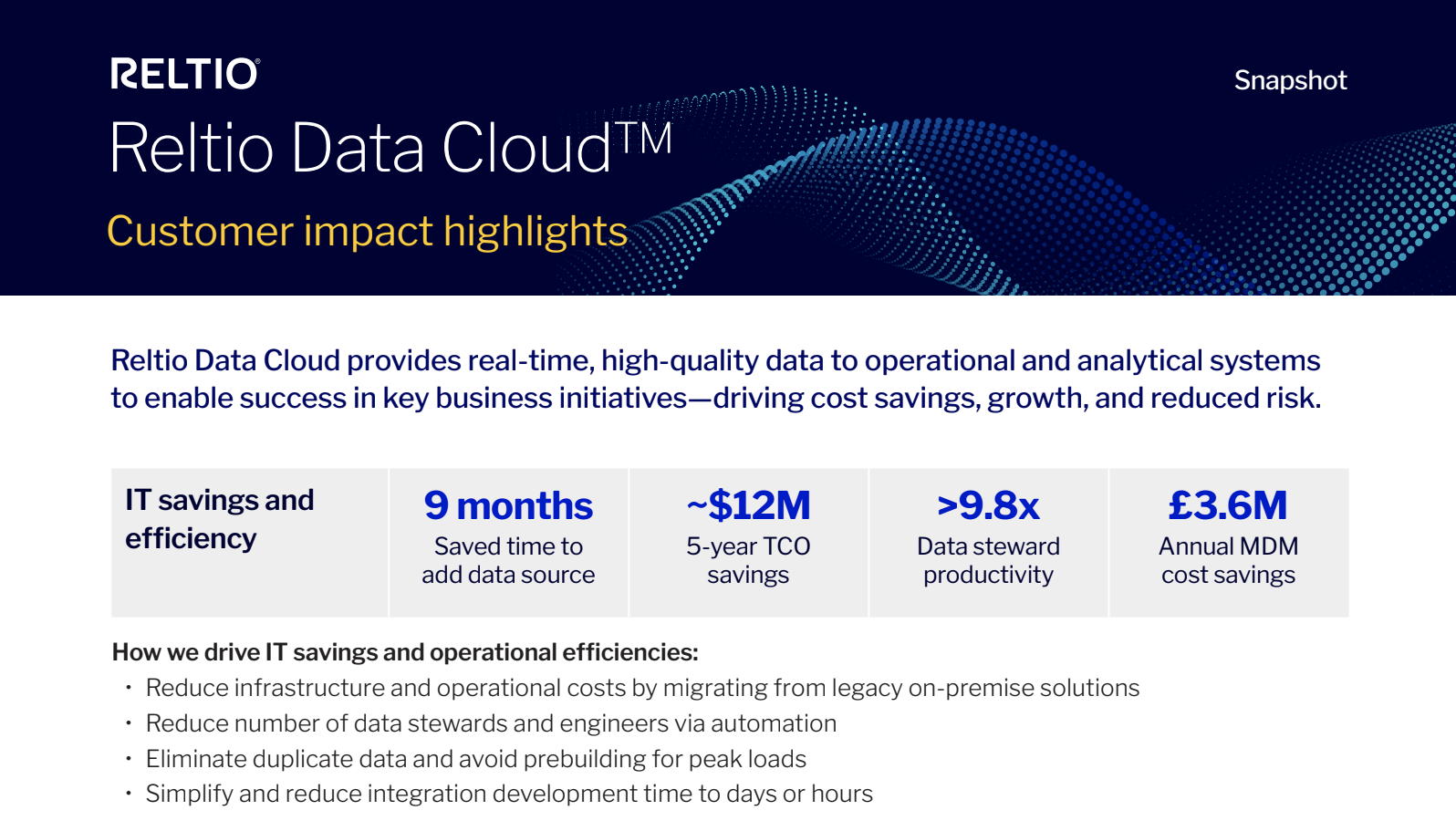 Reltio Data Cloud provides real-time, high-quality data to operational and analytical systems to enable success in key transformative initiatives. With the right data foundation, our customers across the globe achieve IT and business cost savings, drive higher growth, and reduce risk. This snapshot provides sample customer outcomes and business success stories.